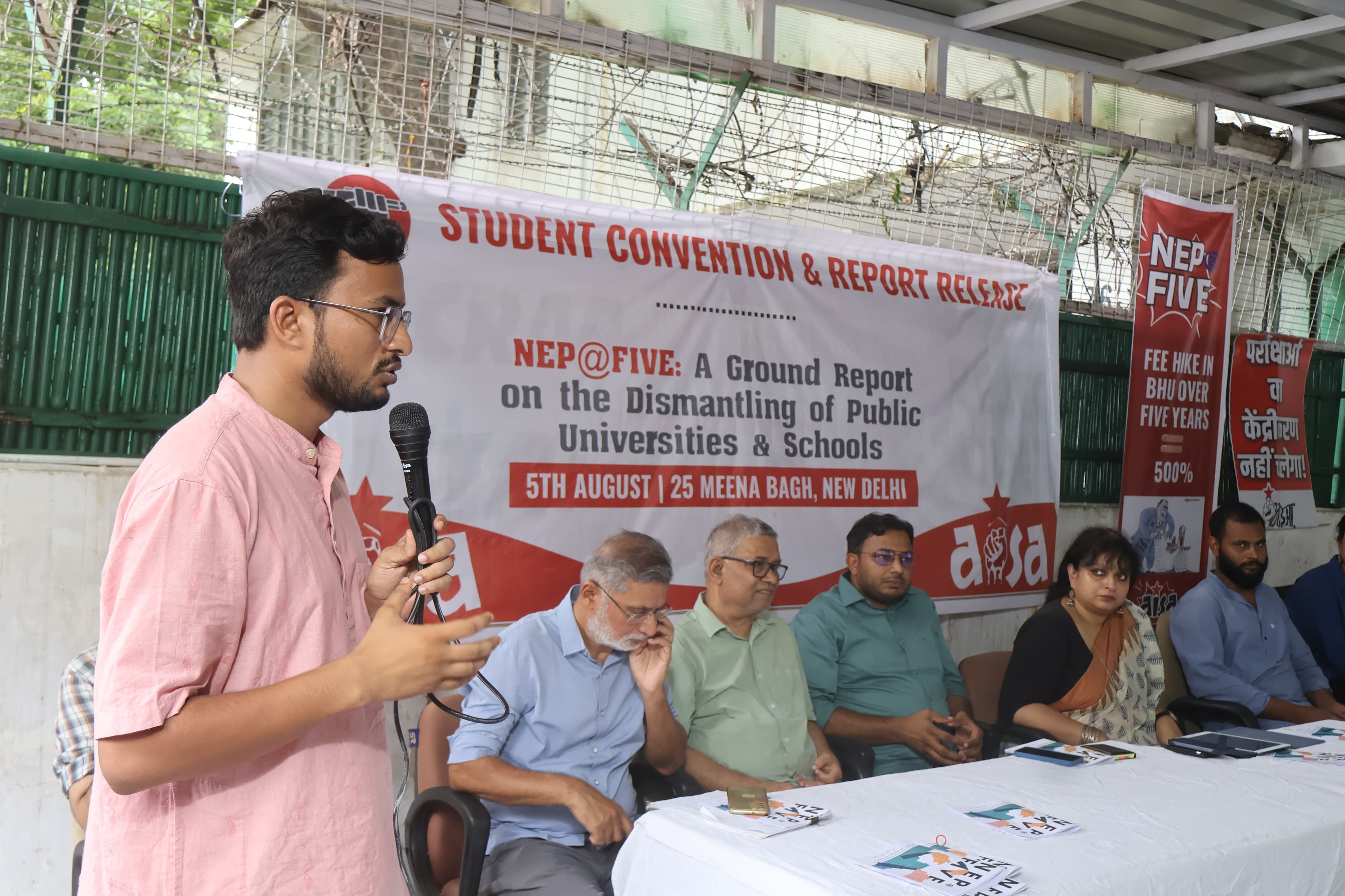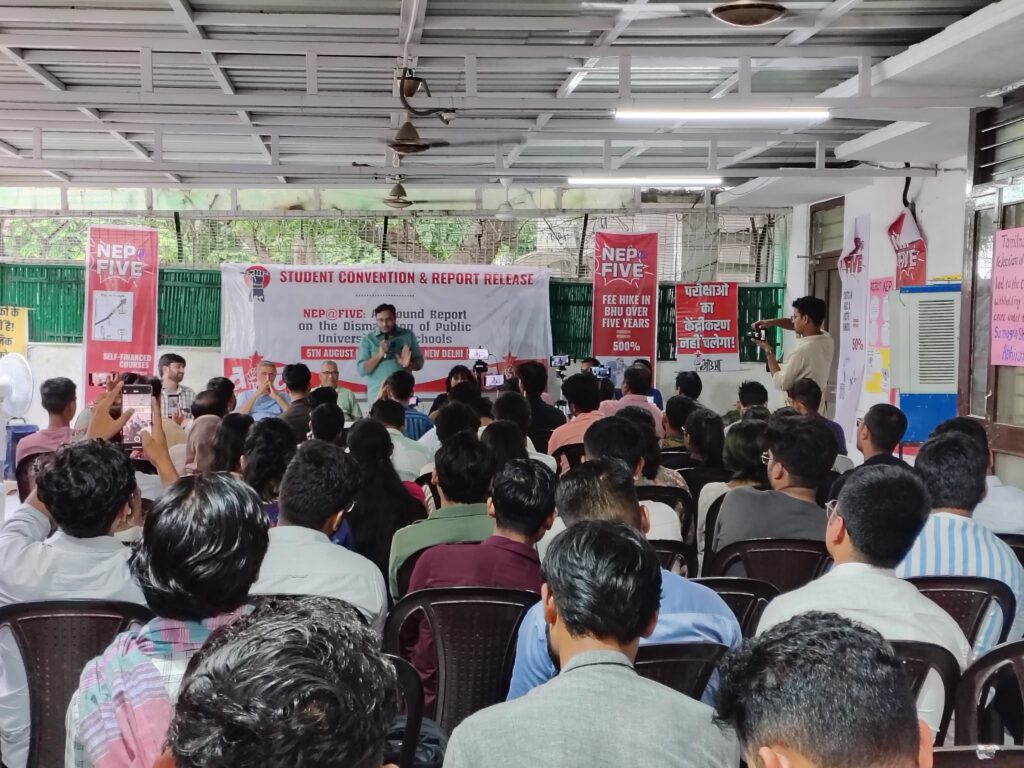 All India Students’ Association (AISA) spearheaded the publication of NEP@Five, a critical ground report examining the disastrous effects of the National Education Policy over the previous five years, in a powerful demonstration of group resistance. The report, which was put together using testimonies and in-depth fieldwork from more than 20 central and state universities in 12 states, emphasises how NEP has exacerbated caste and class divisions, accelerated the decline of public education, and placed the onus of affordability and access on students. Academics and student leaders from JNU, DU, AUD, and AMU- the universities most affected by and therefore at the centre of the resistance- spoke at the convention.